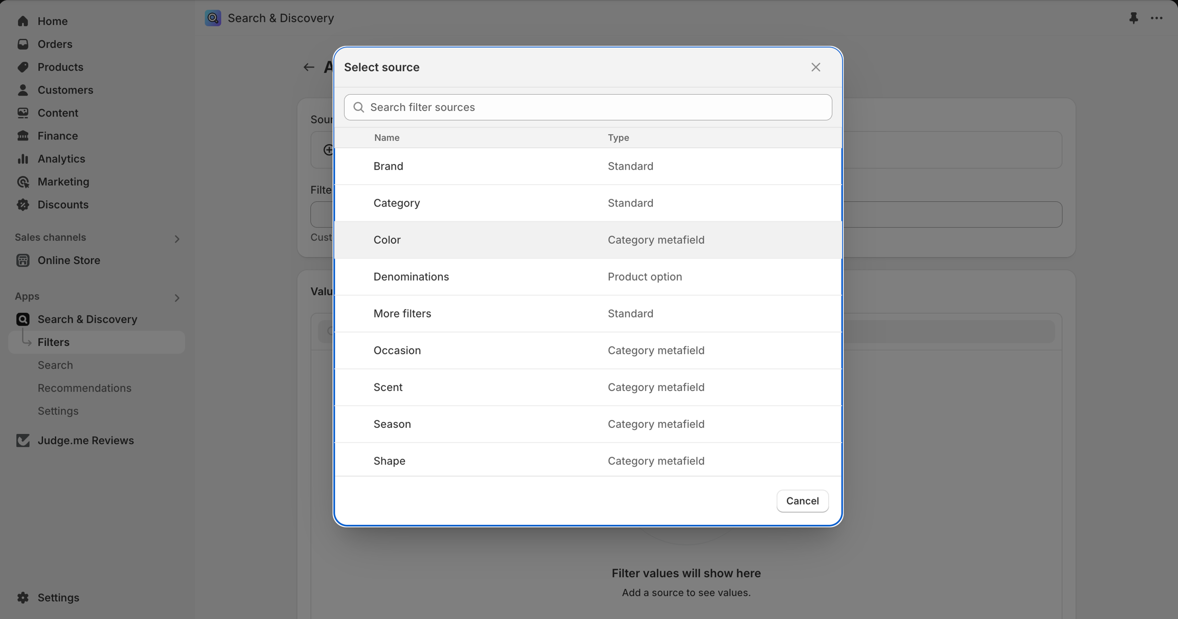 Select a Source for the filter options. Sources can be variant options, tags, or metafields.
