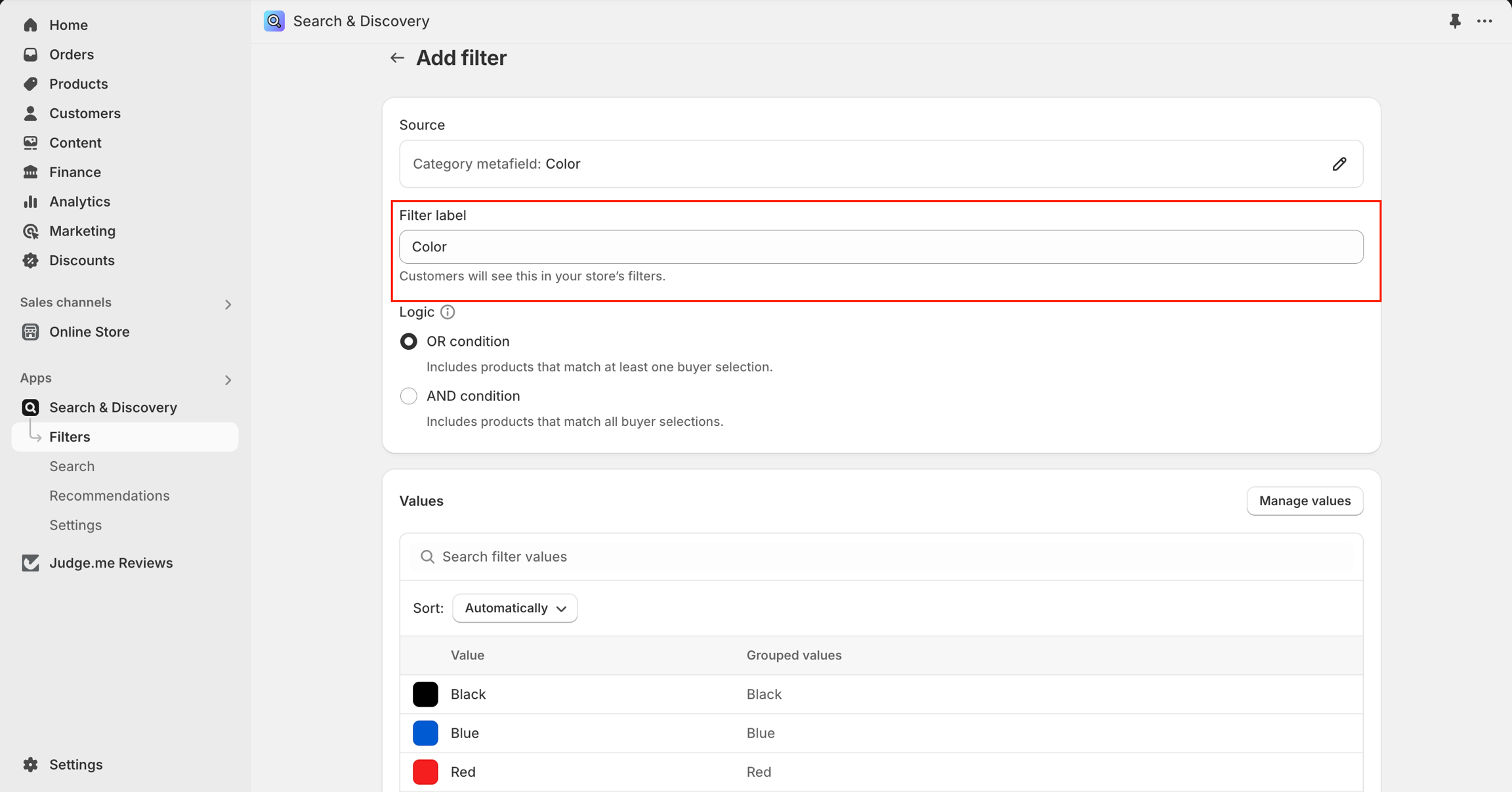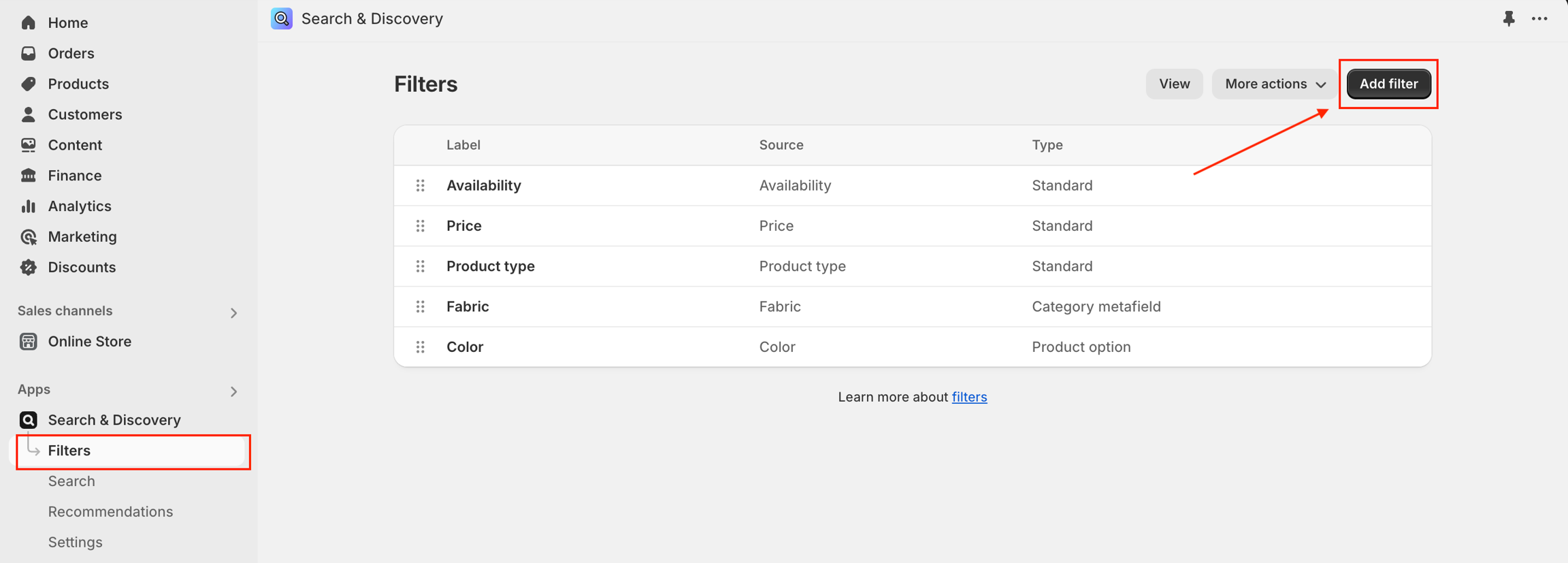 In the Shopify Search & Discovery app, go to Filters, and then click Add filter.