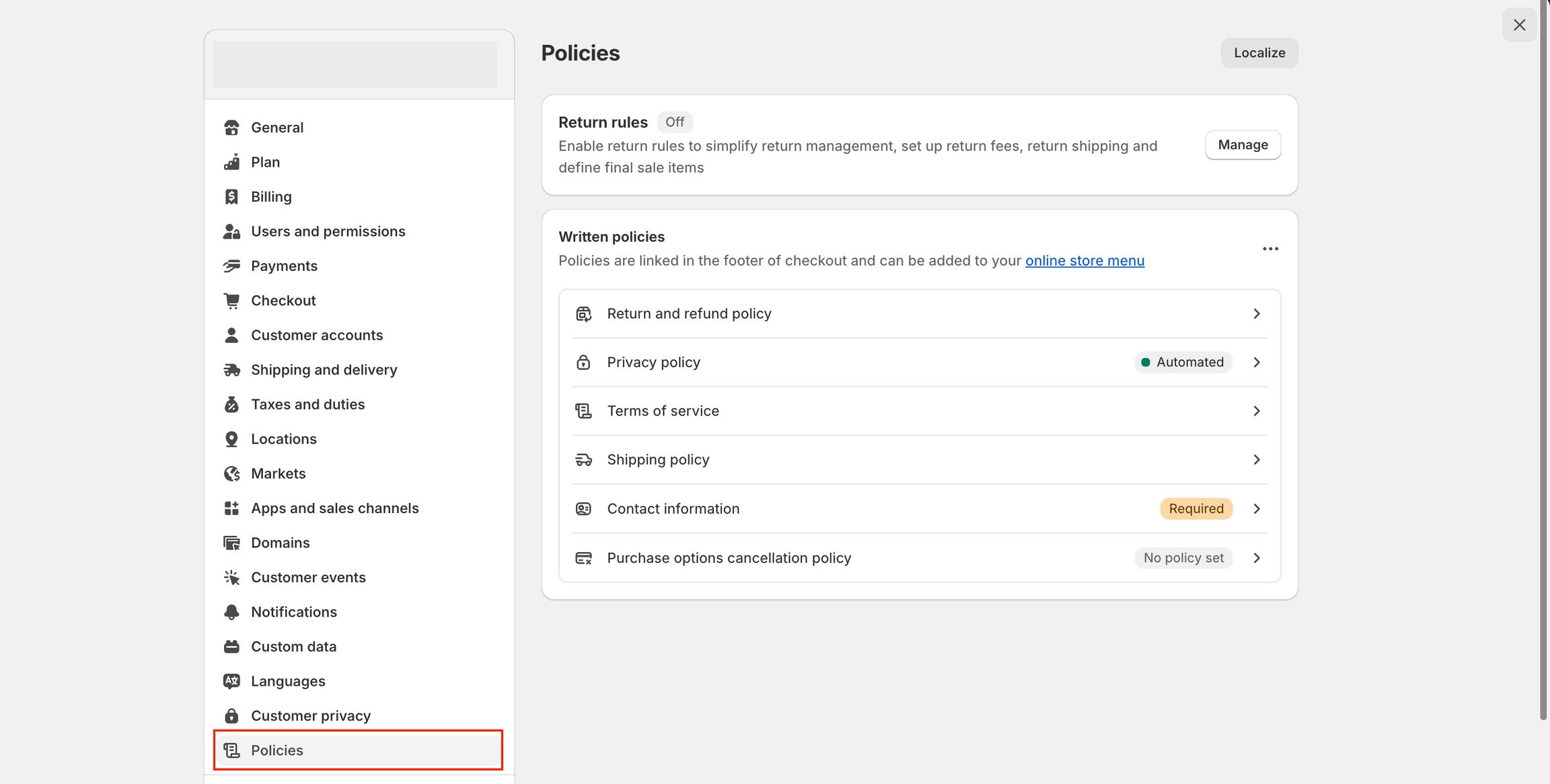 You can add or edit policies for your store. Although Shopify can generate templates, you're responsible for following your published policies. Review your policies carefully before adding them.