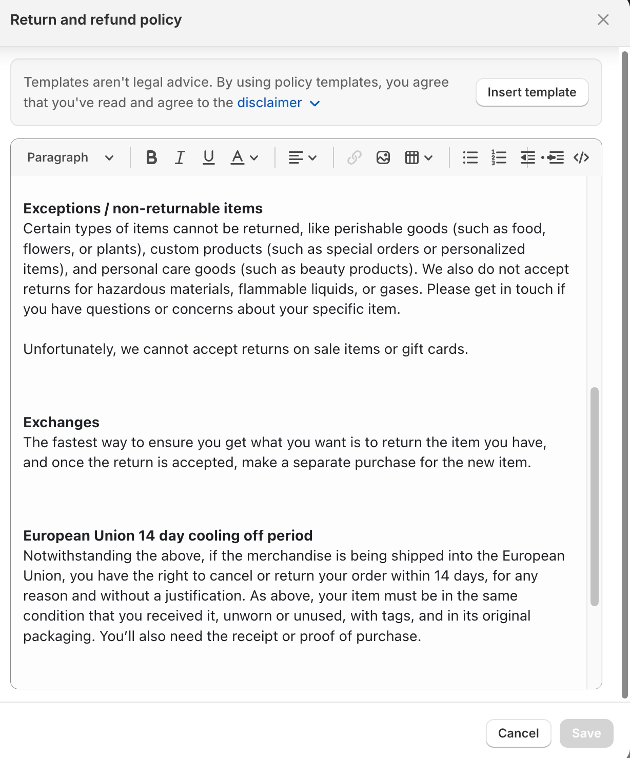 Edit your store policies, use the rich text editor to add style and formatting to your policies, and add links and images.